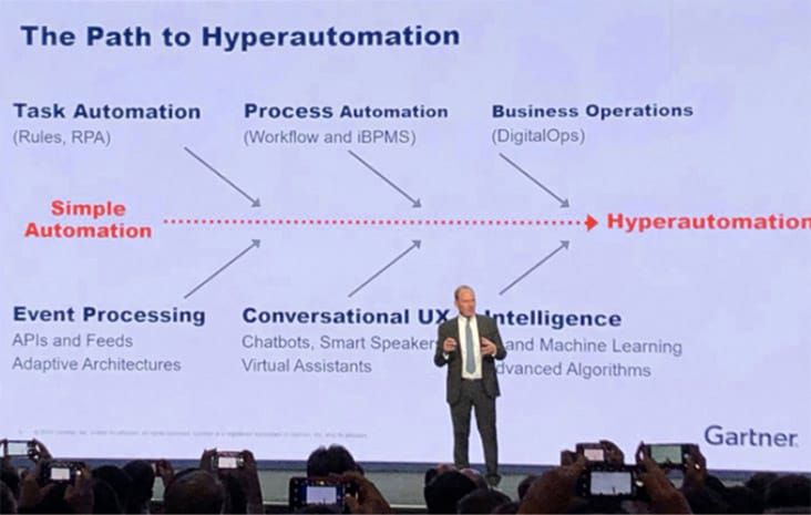 Enfoque en el cual las organizaciones identifican, examinan y automatizan rápidamente, tanto los procesos de negocio como de TI, de forma disciplinada. Esta tecnología automatiza tareas que alguna vez requirieron manos humanas,  se ocupa en la aplicación de tecnologías como Inteligencia Artificial y Machine Learning para aumentar, de forma exponencial los procesos.